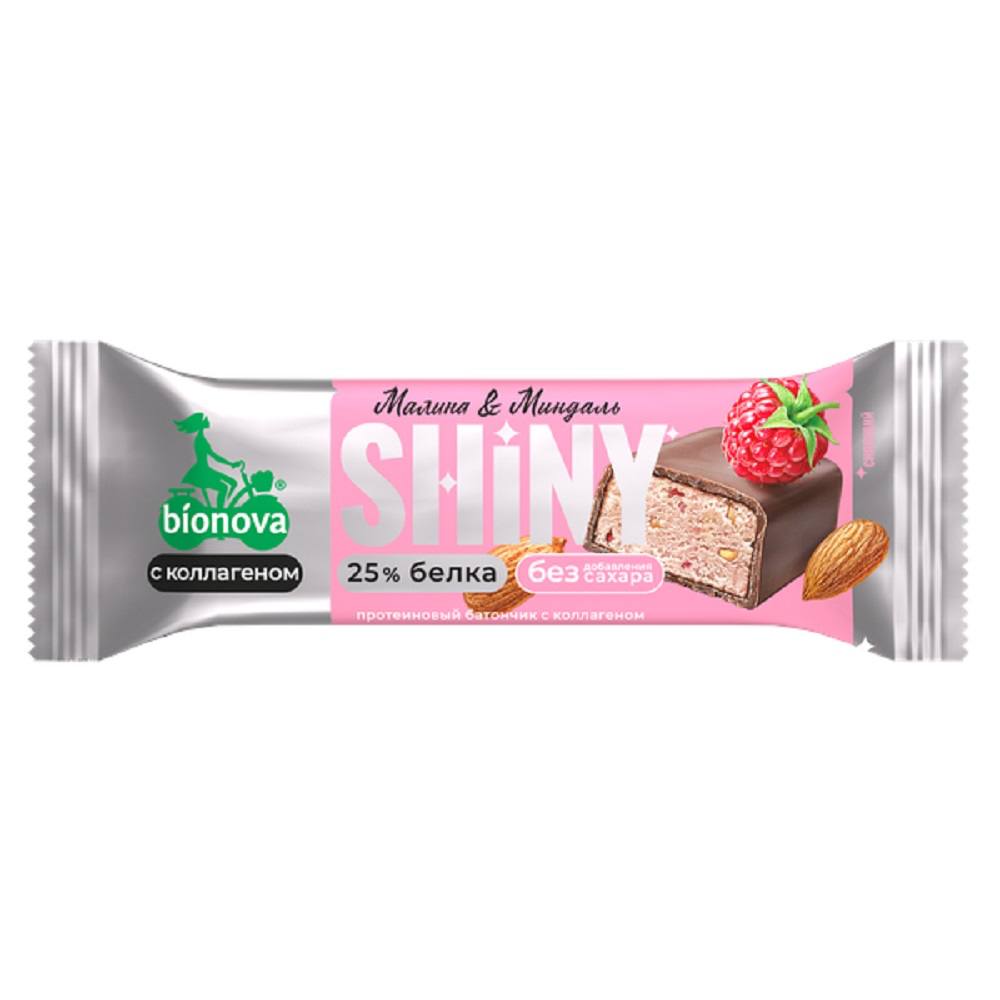 Глазированный протеиновый батончик Shiny Bionova® Малина-миндаль это вкусный и сбалансированный перекус для тех, кто заботится о себе. Содержит 25% белка, что помогает поддерживать мышцы, ускоряет восстановление после тренировок и способствует длительному насыщению. Идеально подойдёт тем, кто придерживается активного образа жизни, следит за питанием и хочет совместить вкус и пользу.