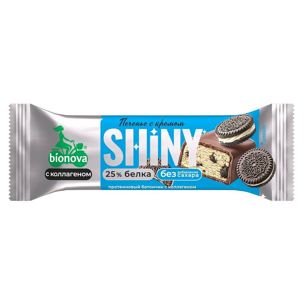 Глазированный протеиновый батончик Shiny Bionova® Печенье с кремом — это вкусный и сбалансированный перекус для тех, кто заботится о себе. Содержит 25% белка, что помогает поддерживать мышцы, ускоряет восстановление после тренировок и способствует длительному насыщению.Идеально подойдёт тем, кто придерживается активного образа жизни, следит за питанием и хочет совместить вкус и пользу.